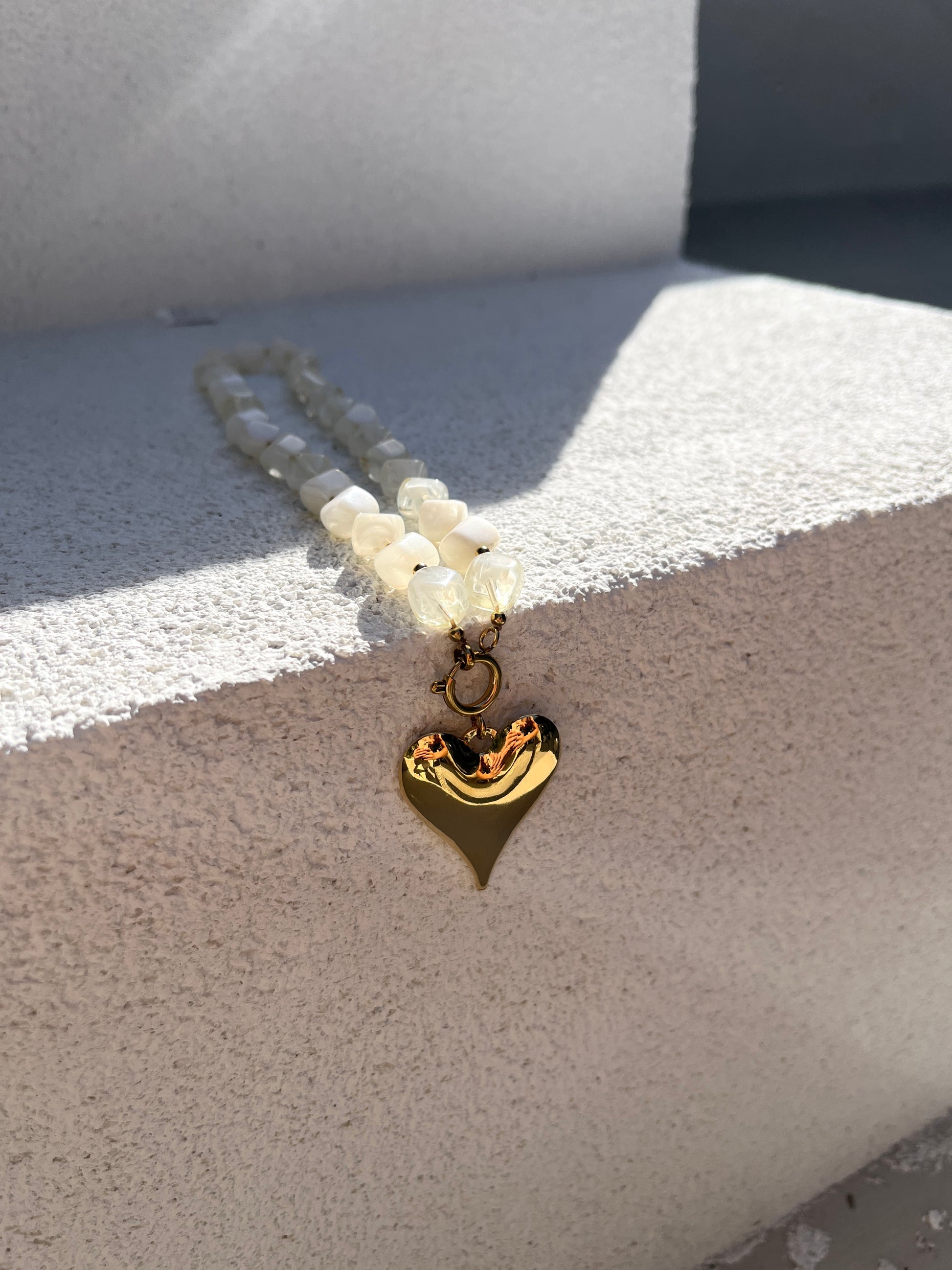 Deze trendy ketting combineert glaskralen met gouden kralen voor een speelse en opvallende look. De ketting sluit met een boeislot, waaraan een prachtig groot hartbedel hangt – een echte eye-catcher die elke outfit direct een trendy boost geeft. Gemaakt van RvS en volledig nikkelvrij, waardoor hij comfortabel en huidvriendelijk is. Perfect voor wie een fashion statement wil maken met sieraden die opvallen!